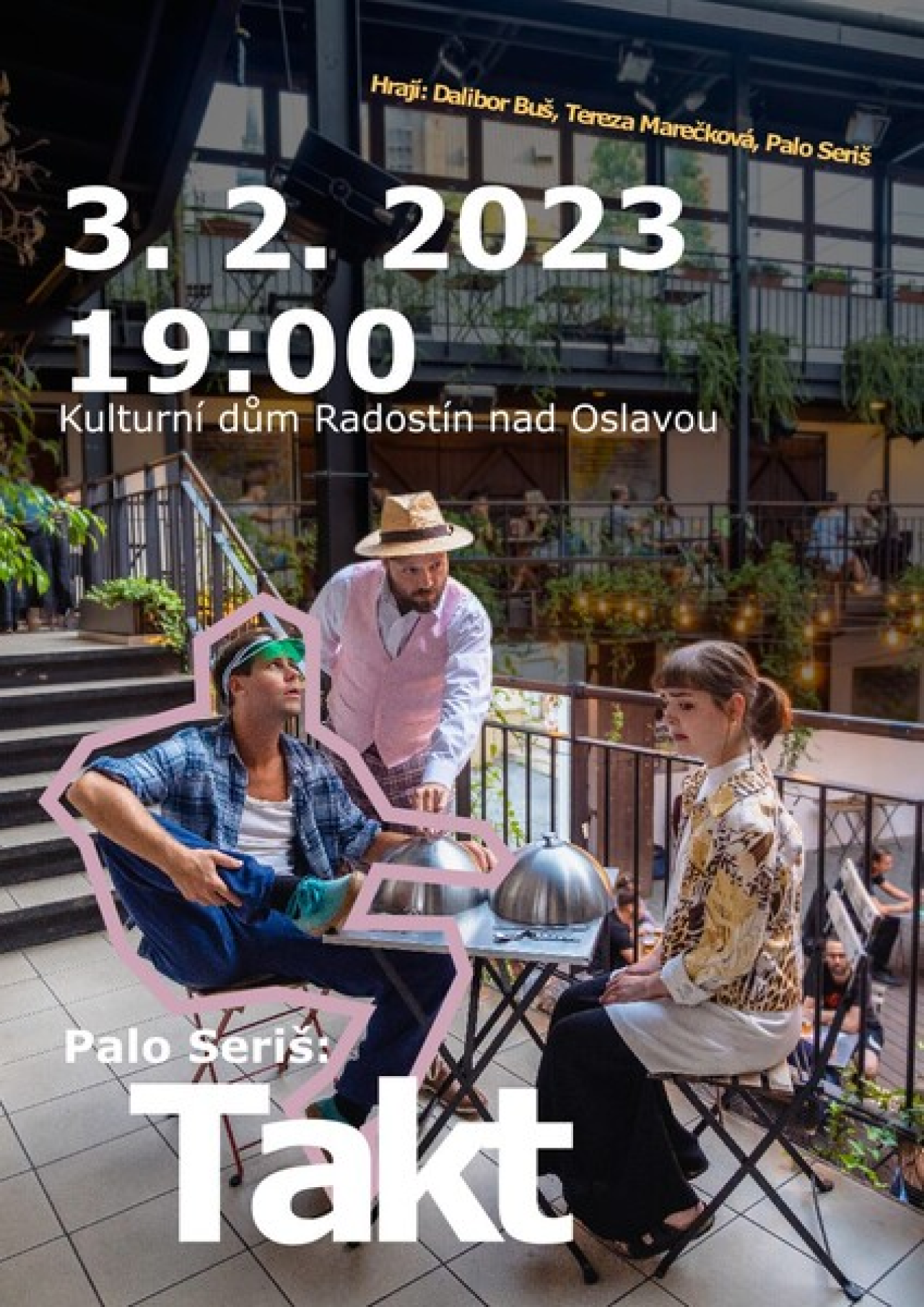 Herci brněnského divadla „Husa na provázku“ vás srdečně zvou na představení TAKT, které se uskuteční v pátek 3. února 2023 v kulturním domě v Radostíně nad Oslavou.