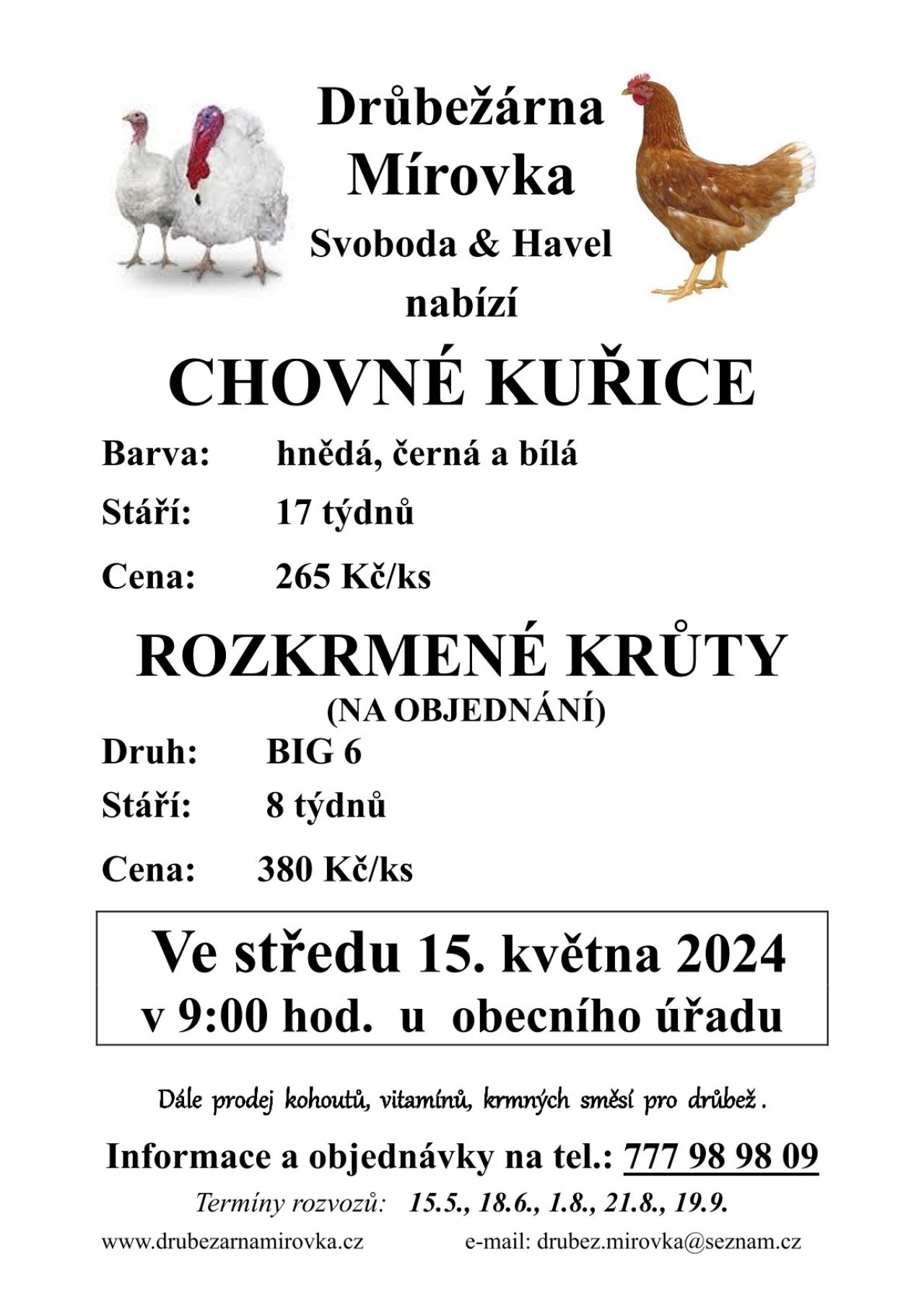 Drůbežárna Mírovka Svoboda nabízí chovné kuřice 15.5.2024 od 9:00 hodin