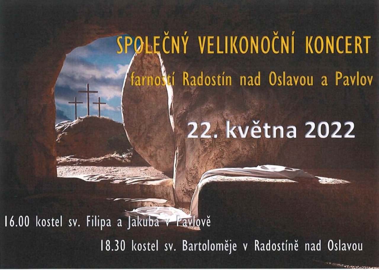 Farní pěvecký sbor Vás srdečně zve Farní pěvecký sbor Vás srdečně zve na společný velikonoční koncert farnosti Radostín nad Oslavou a Pavlov, který se bude konat 22.5.2022 v 16:00 hodin
