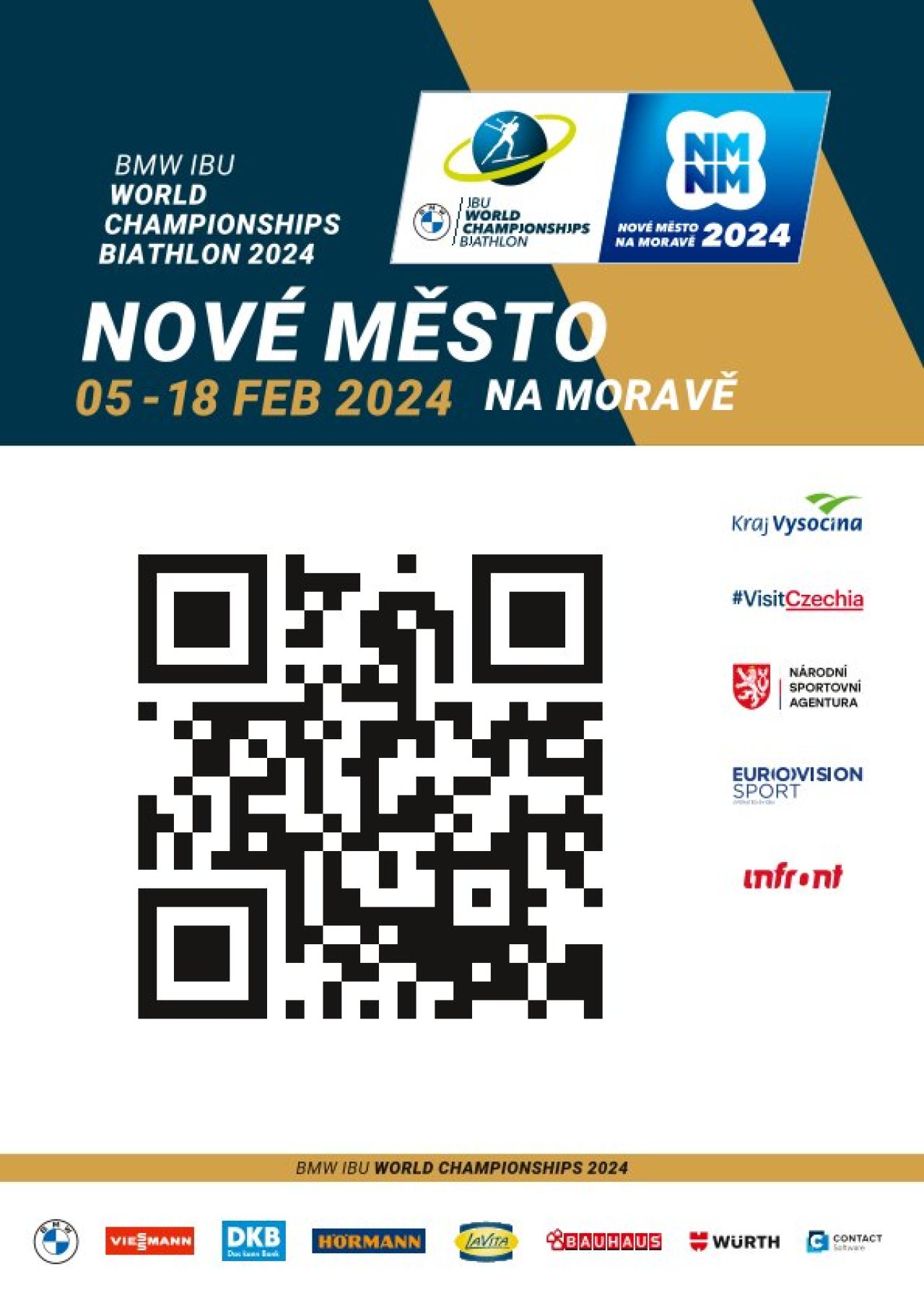 QR kód od organizátorů MS Biatlonu, který směřuje na webový portál, kde najdete všechny důležité informace pro vás i vaše hosty. Kromě informací o programu najdete na webu informace k dopravě, závodům a také kontakt, který je po celou dobu biatlonu k dispozici. https://www.biathlonnmnm.cz/