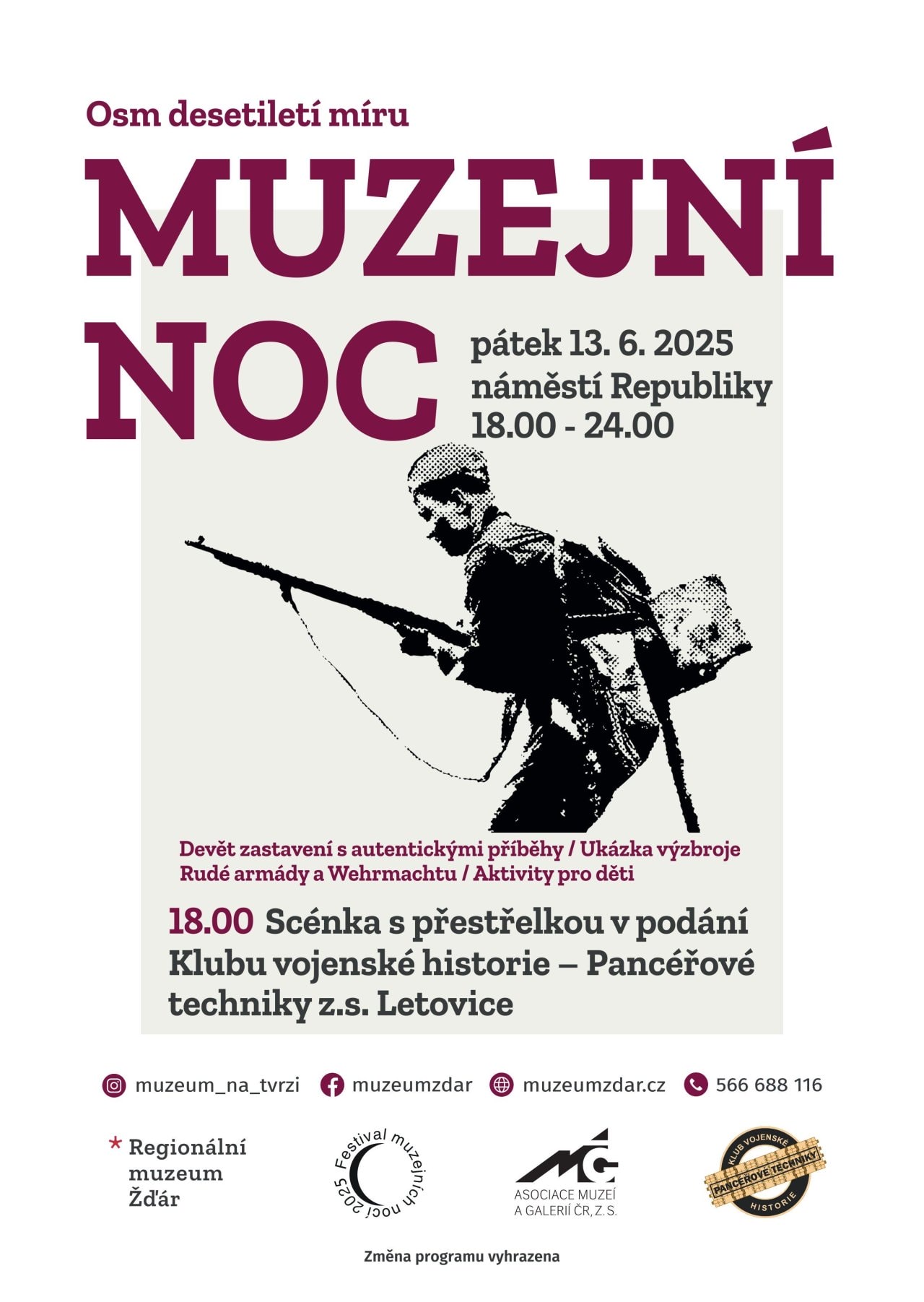 13. června na Muzejní noc, kterou letos věnujeme vzpomínce na události konce 2. světové války ve Žďáře. Mezi 18. a 24. hodinou se naše město promění v živý příběh plný historie, která nás spojuje.