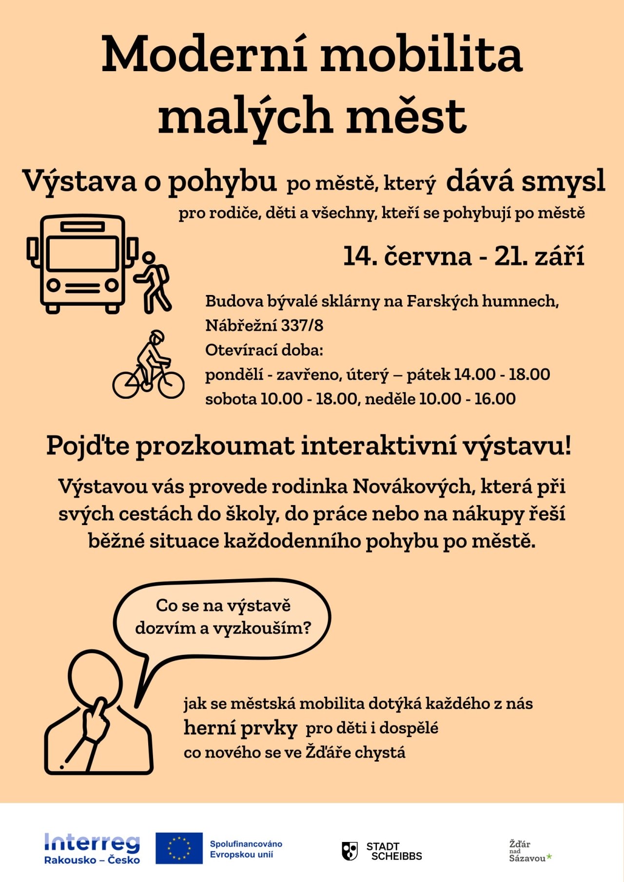 Výstavu Moderní mobilita malých měst – výstavu o pohybu po městě, který dává smysl. Výstava interaktivní formou přibližuje, co městská mobilita znamená a jak se dotýká každého z nás. Na své si na výstavě přijdou dospělí i děti. Čeká na ně prolézačka v podobě legendárního autobusu double-decker, nákup v supermarketu, parkování na přeplněném parkovišti nebo koutek s balančními prvky.