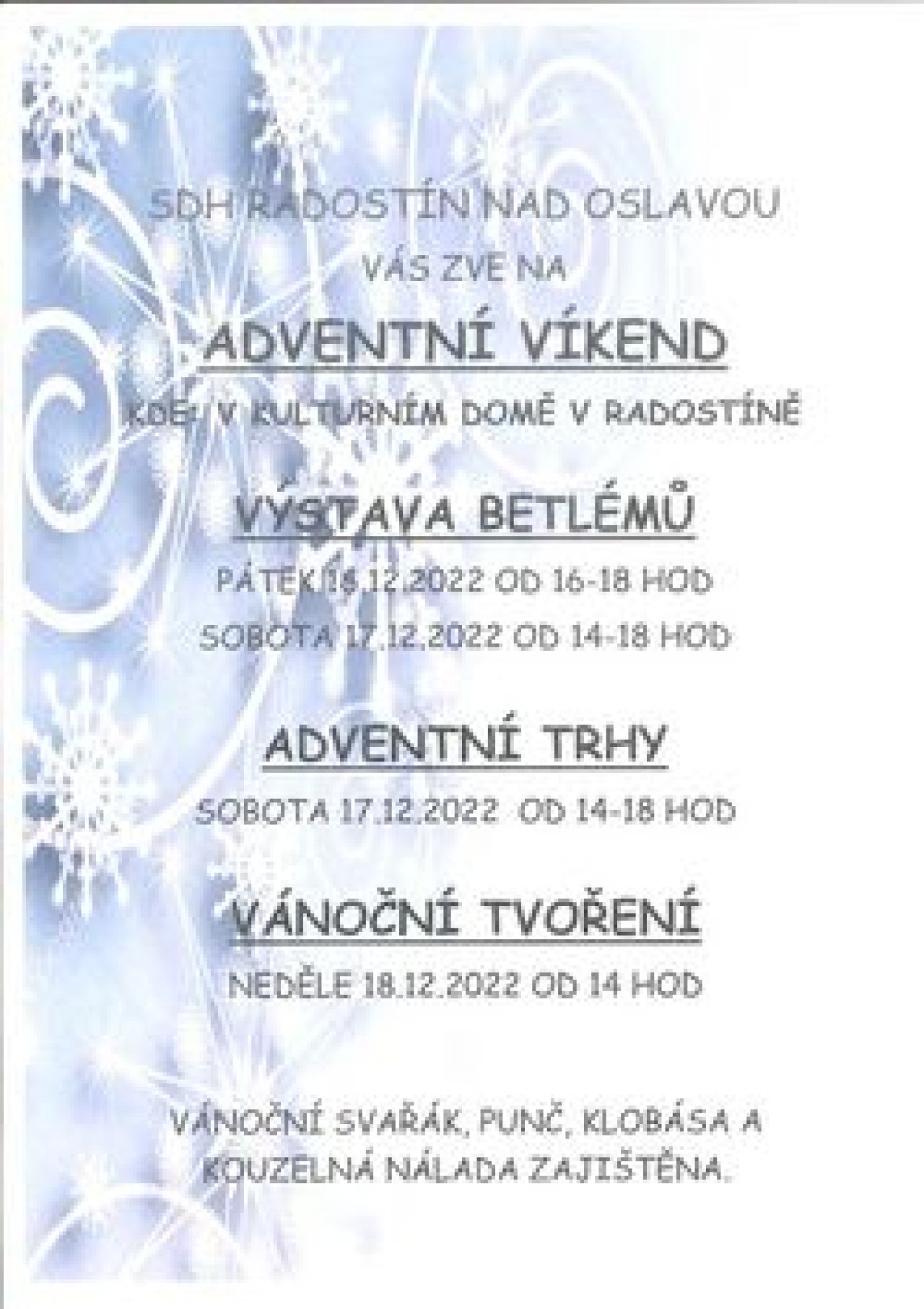 SDH Radostín nad Osl. Vás zve na adventní víkend (výstava betlémů, adventní trhy, vánoční tvoření)