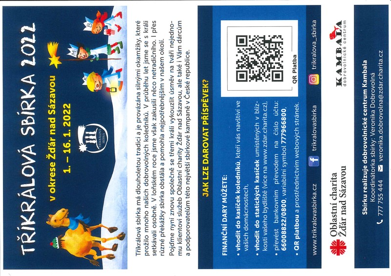 Oznamujeme občanům, že v sobotu 8.ledna 2022 od 13:00 hodin proběhne v naší obci Tříkrálová sbírka.