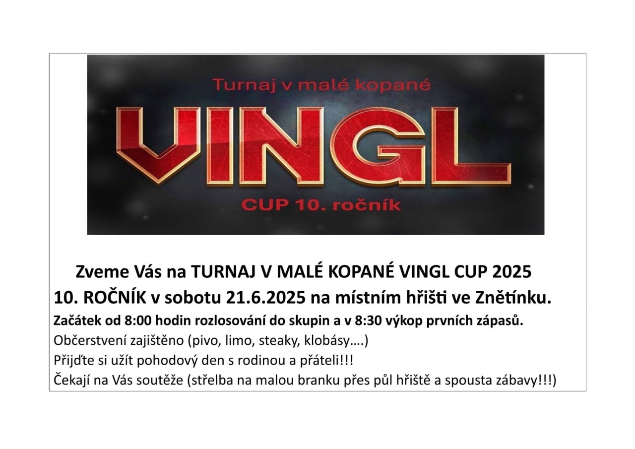 Zveme Vás na turnaj v malé kopané na VINGL CUP 10 ročník v sobotu 21.6.2025 od 8:00 hodin na místním hřišti ve Znětínku