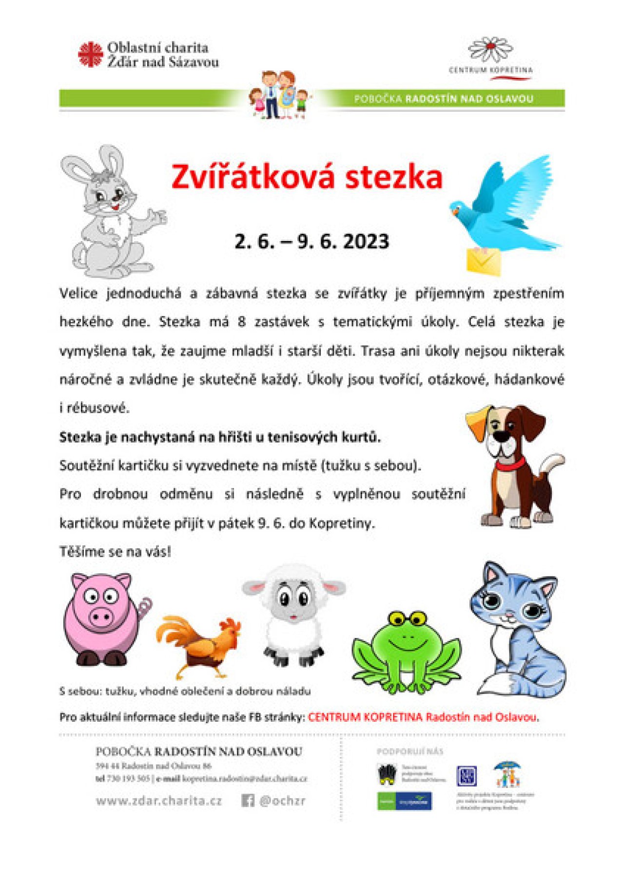 Zvířátková stezka 2.6. - 9.6.2023 pozvánka Centra Kopretiny v Radostíně nad Oslavou