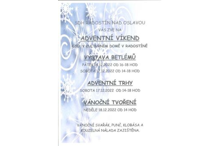 SDH Radostín nad Osl. Vás zve na adventní víkend (výstava betlémů, adventní trhy, vánoční tvoření) 12.12.2022 Adventni-vikend.pdf Číst více