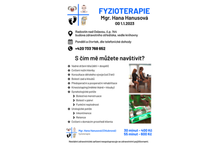 FYZIOTERAPIE - Mgr. Hana Hanusová od 1.1.2023 v budově zdravotního střediska Radostín nad Oslavou č.p.144 13.12.2022 FYZIOTERAPIE - Mgr. Hana Hanusová od 1.1.2023 v budově zdravotního střediska Radostín nad Oslavou č.p.144 Číst více