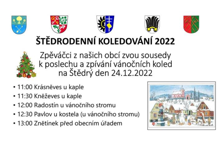 Štědrodenní koledování 2022 ve 13:00 hodin před obecním úřadem ve Znětínku 14.12.2022 Štědrodenní koledování 2022 Zveme sousedy 24.12.2022 na pěvecké vystoupení našich zpěváčků v okolních obcích dle programu viz. plakátek. Číst více