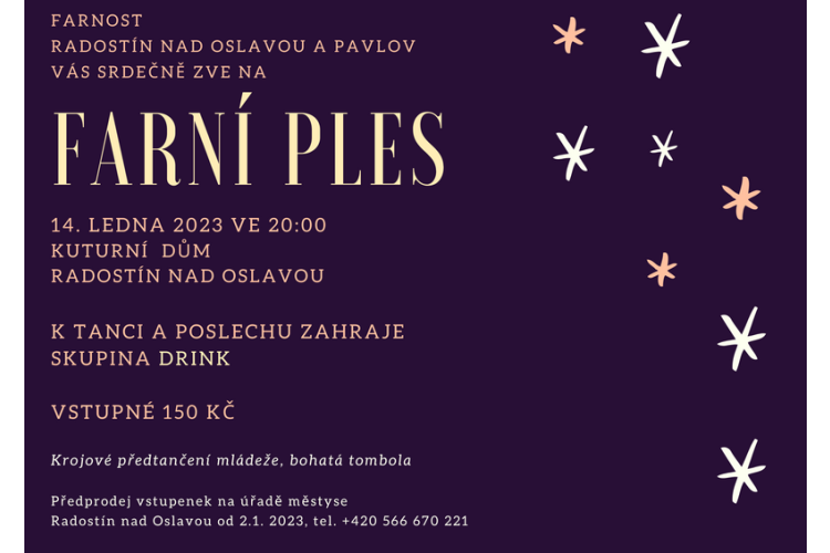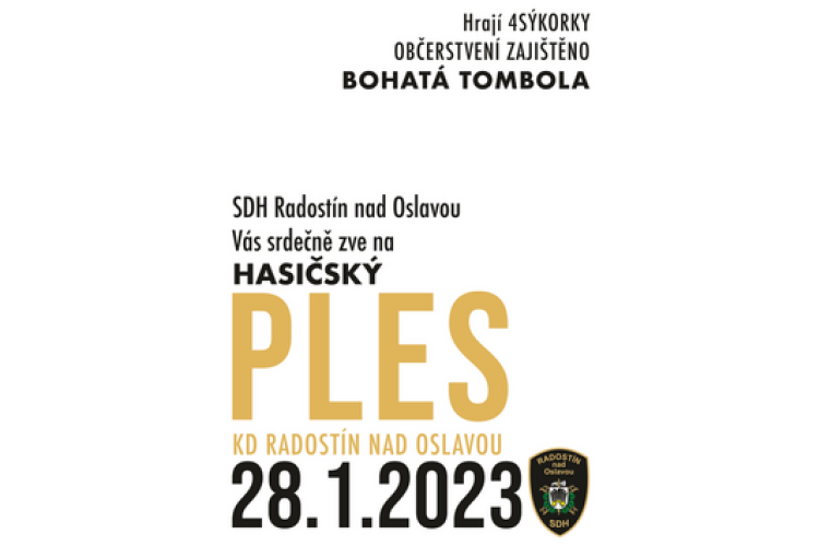 Hasičský ples v sobotu 28.1.2023 v Radostíně nad Oslavou 12.1.2023 Hasičský ples v sobotu 28.1.2023 Číst více