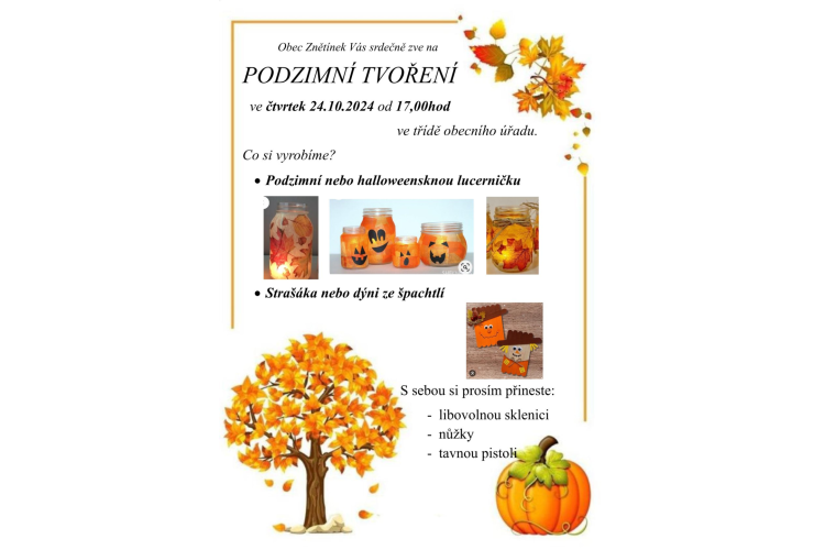 Obec Znětínek Vás zve na podzimní tvoření ve ČT 24.10.2024 od 17:00 hodin ve třídě na OÚ 22.10.2024 Číst více