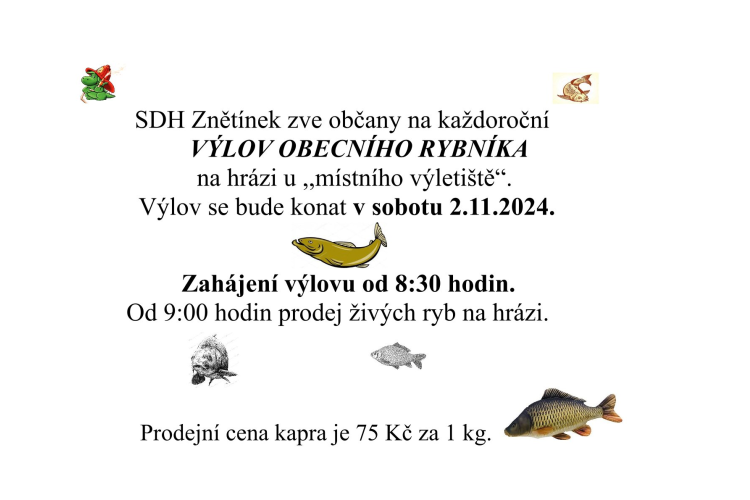 Zeras a.s. oznamuje občanům prodej ryb dne 19.11.2024 a úhradu odebraných naturálií dne 21.11.2024 18.11.2024 ZERAS a.s. Radostín nad Oslavou oznamuje, že v obci Znětínek bude zítra 19. 11. 2024 prodávat ryby na obvyklém místě. Cena za 1 kg 70 Kč.… Číst více
