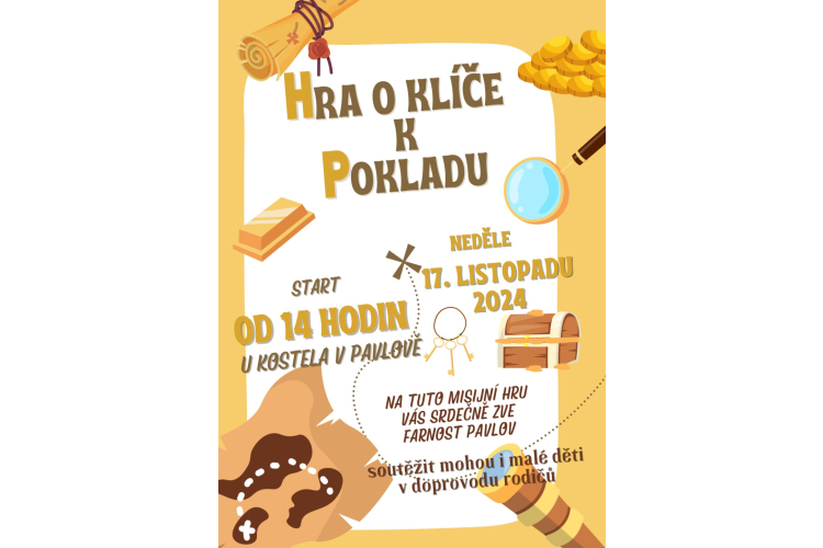 Farnost Pavlov Vás zve na hru o klíče k pokladu dne 17.11.2024 od 14:00 hodin 7.11.2024 Farnost Pavlov Vás všechny srdečně zve na hru pro děti a jejich rodiny, která nás uvede a pozve do misijního týdne. Registrace proběhne na startu… Číst více