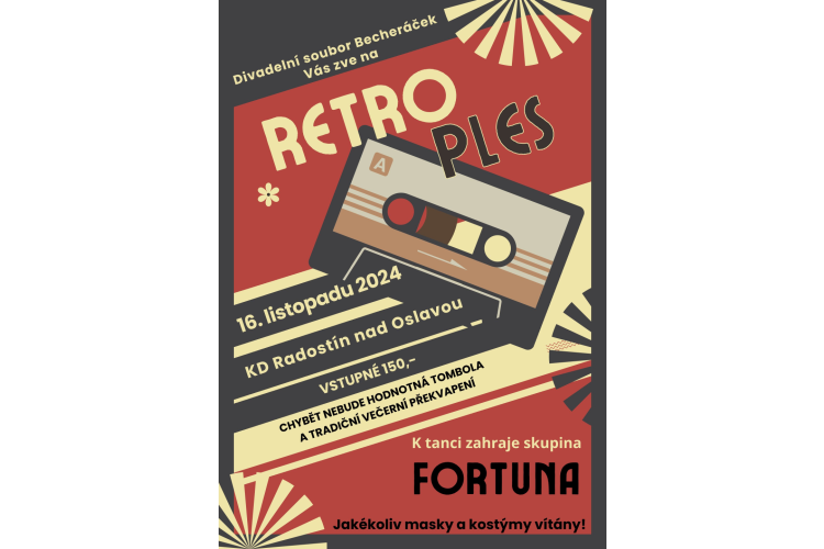 Divadelní soubor Becheráček Vás zve na RETRO PLES v sobotu 16.11.2024 od 20:00 hodin v KD v Radostíně nad Osl. 12.11.2024 Divadelní soubor Becheráček srdečně zve tuto sobotu 16.11.2024 do kulturního domu v Radostíně nad Oslavou na RETRO ples. K tanci i poslechu vám… Číst více