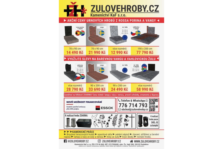 Kamenictví KaF s.r.o. - žulové hroby bude ve středu 14.8. a 21.8.2024 v 13:00 -13:20 přijímat objednávky k opravám hrobů. 7.8.2024 Žulové hroby Kamenictví KaF s.r.o. bude ve středu 14. a 21.8.2024 od 13:00 do 13:20 hodin na našem hřbitově přijímat objednávky na opravy hrobů. Číst více