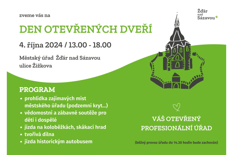 Městský úřad Žďár nad Sázavou Vás zve na DEN OTEVŘENÝCH DVEŘÍ 4.10.2024 od 13:00 do 18:00 27.9.2024 Číst více